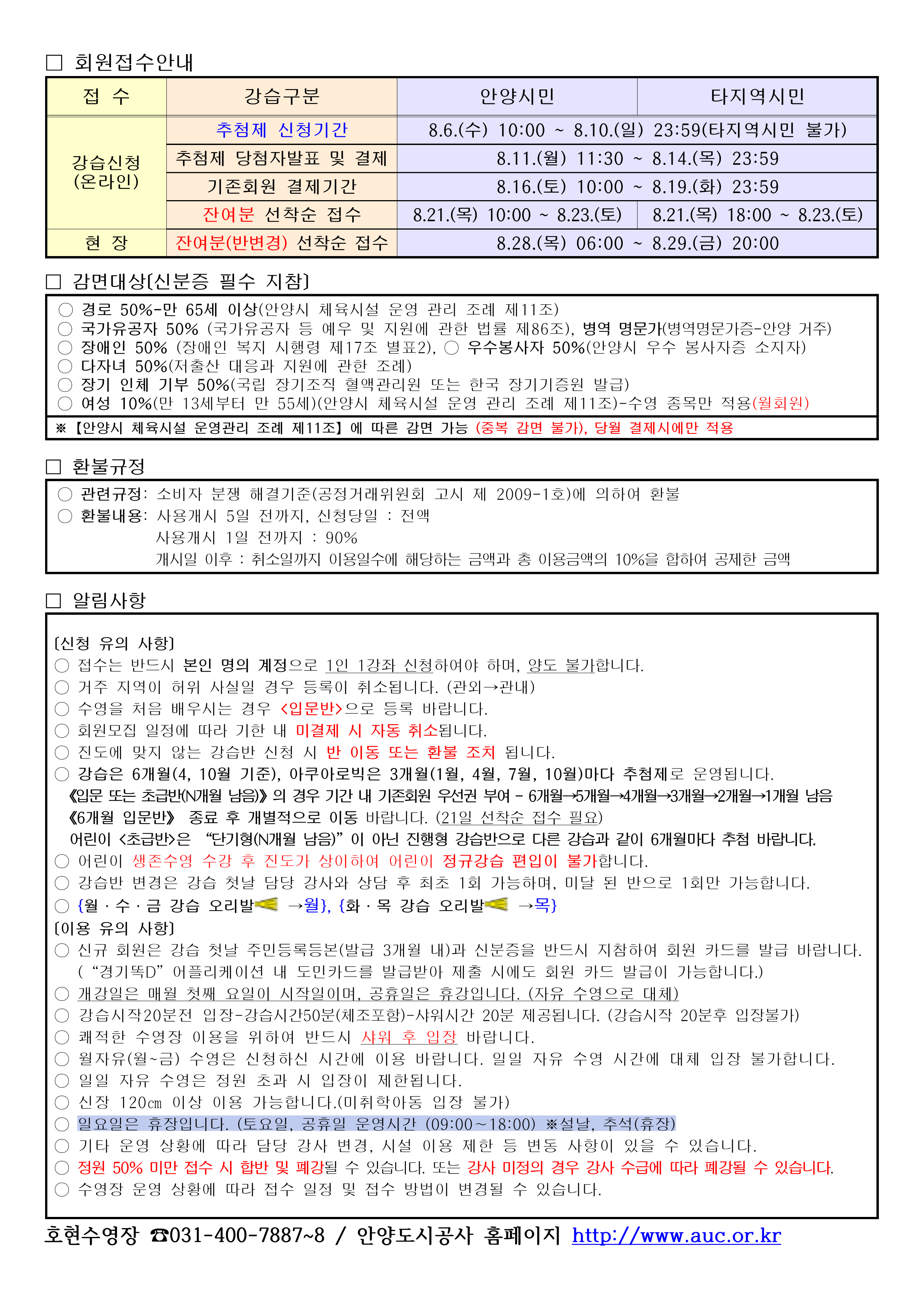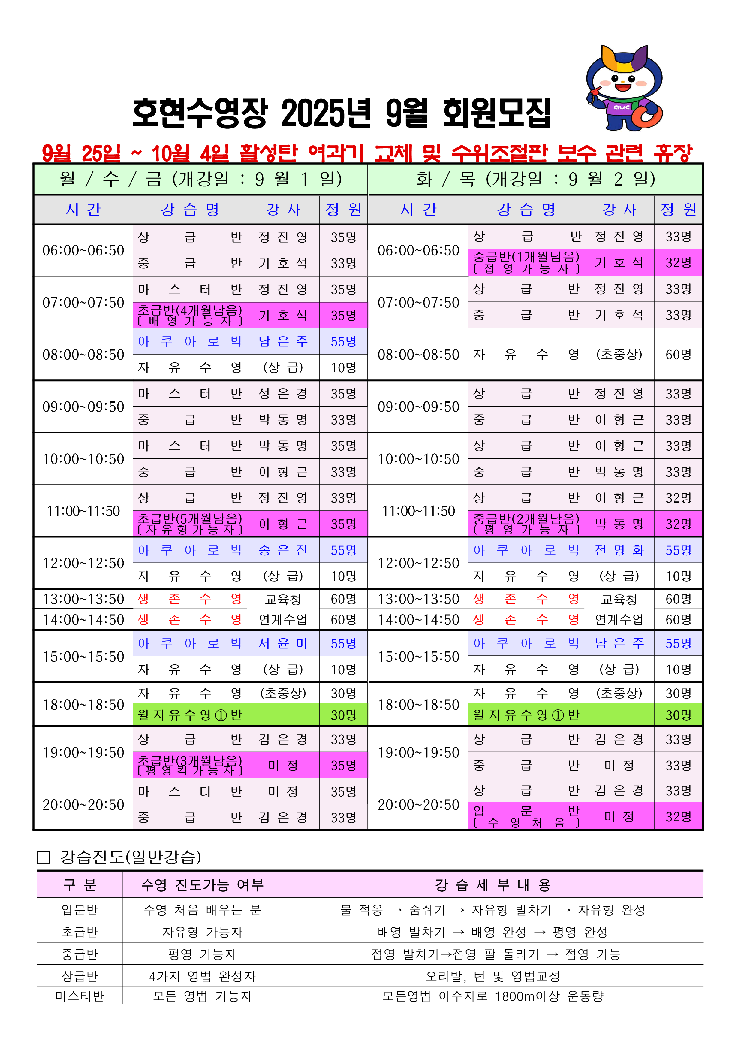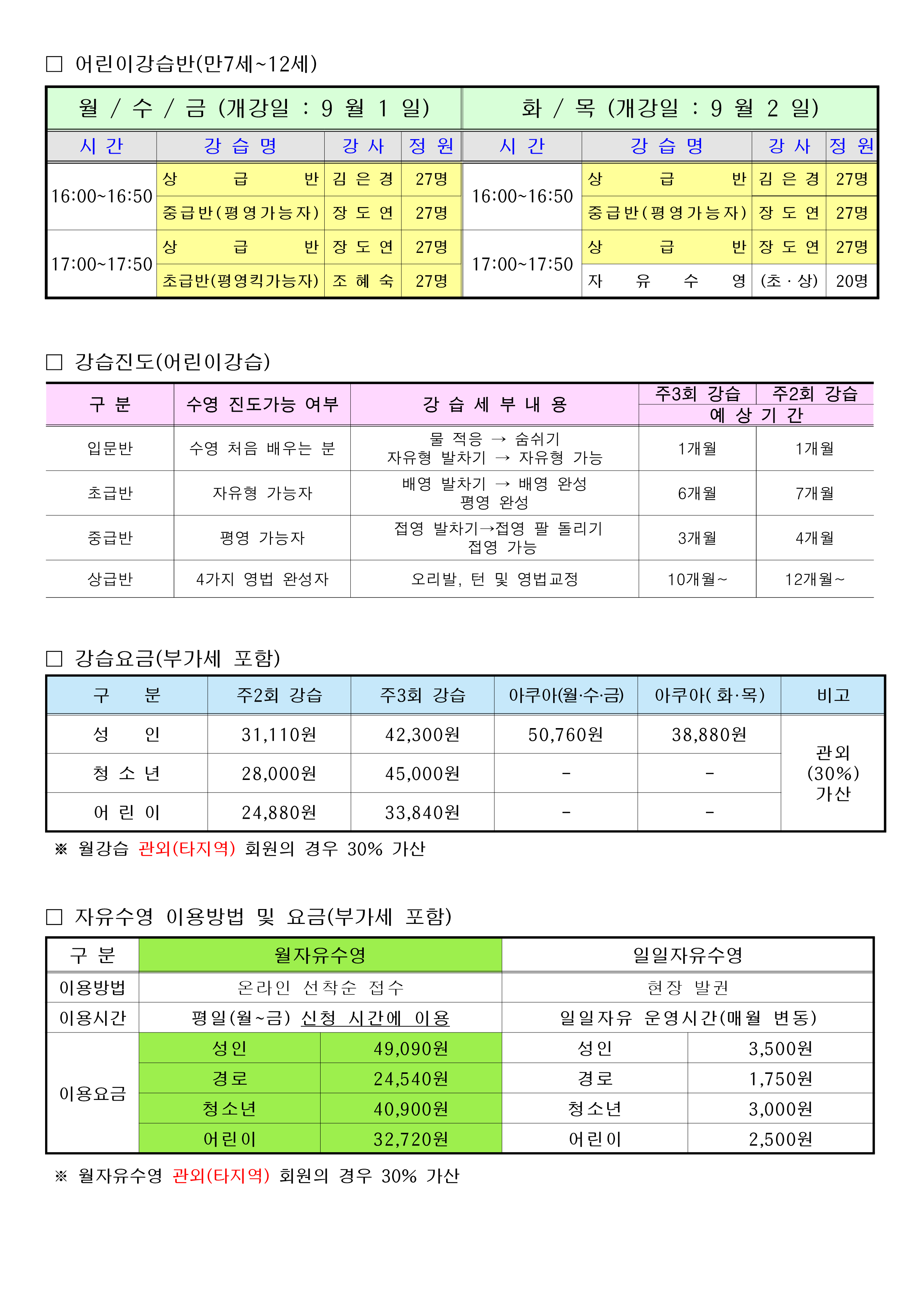 - 8월 일반 강습 회원(중급, 상급, 마스터, 어린이 초급, 어린이 상급, 월자유수영)은 9월 강습까지