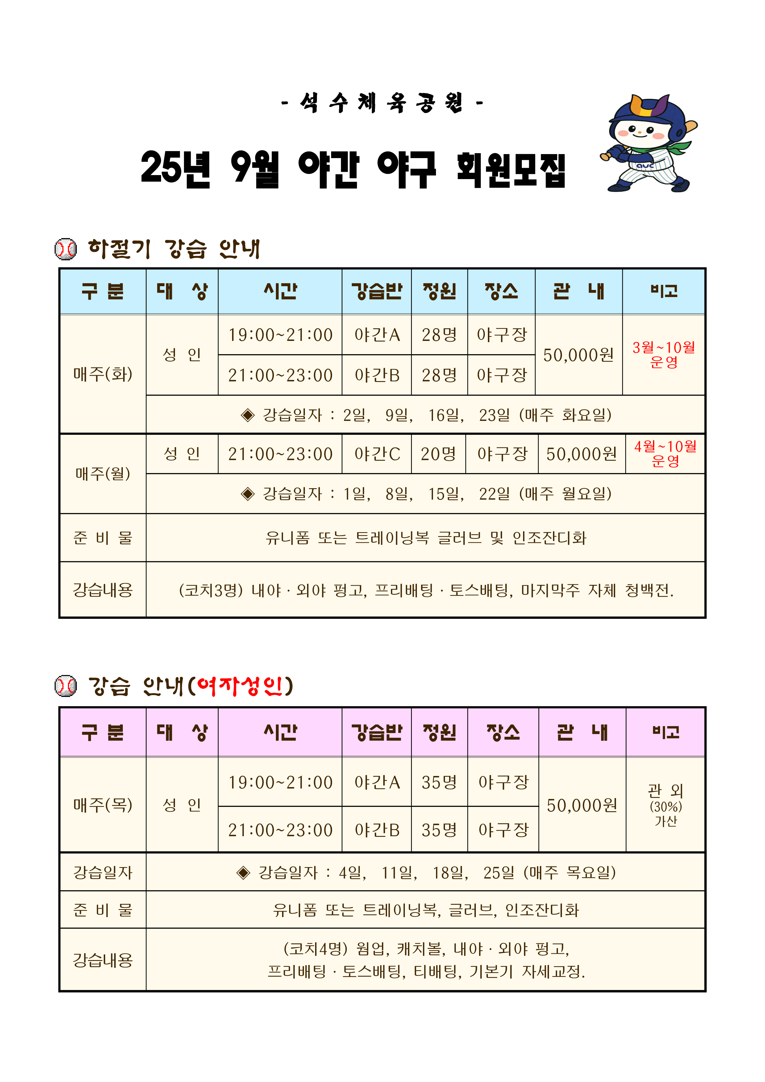 [석수체육공원] 9월 야간야구강습 및 여성야구 강습 안내