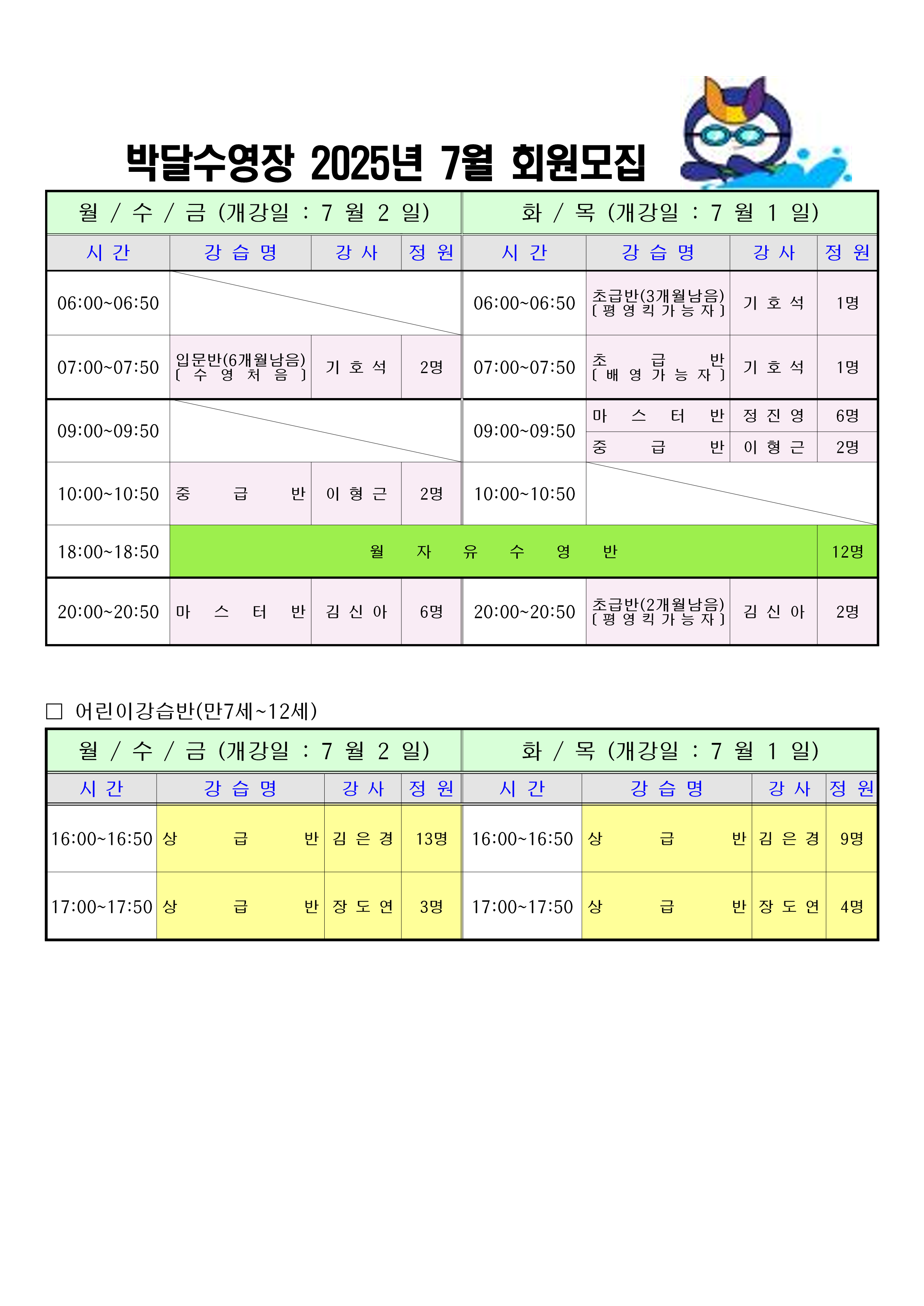 ○2025년 7월 강습 현장접수 일시 : 6월 27일(금), 6월 30일(월) 06:00 ~ 20:00 (장소: 박달수영장 프런트)