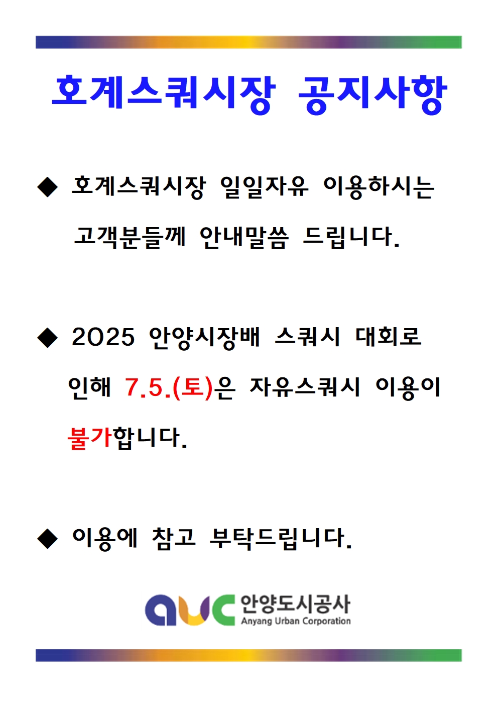 [호계스쿼시장] 2025 안양시장배 스쿼시대회 관련 휴장 안내