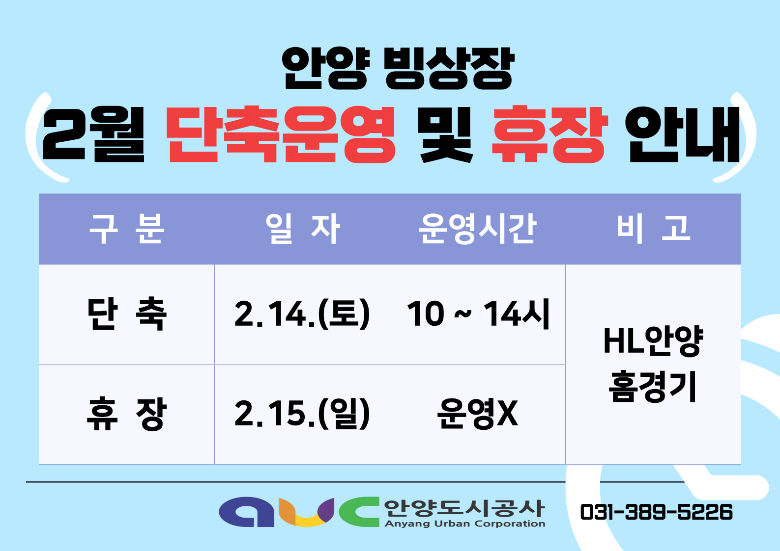 [빙상장] 2026년 2월 단축운영 및 휴장 안내