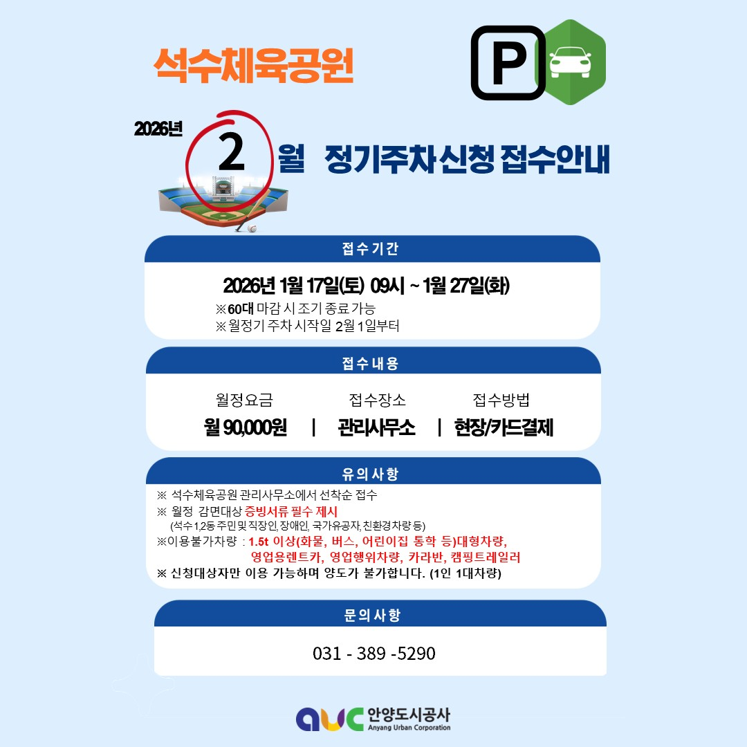 석수체육공원 2026년 2월 월정기주차 신청 접수를 받고자 하오니 많은 관심 부탁드립니다.